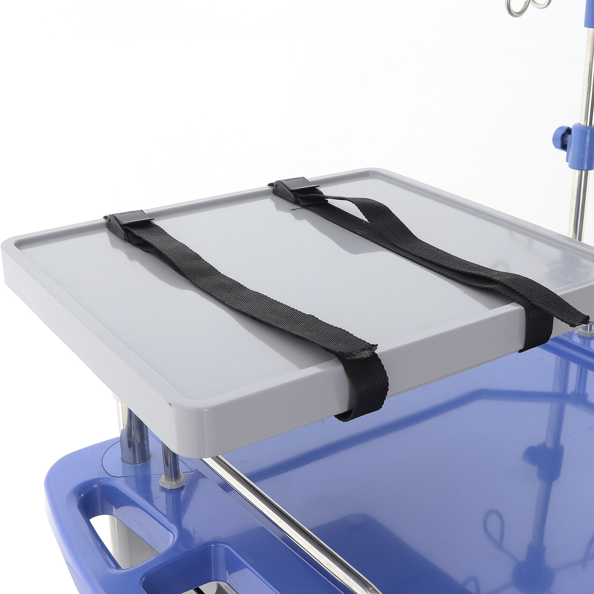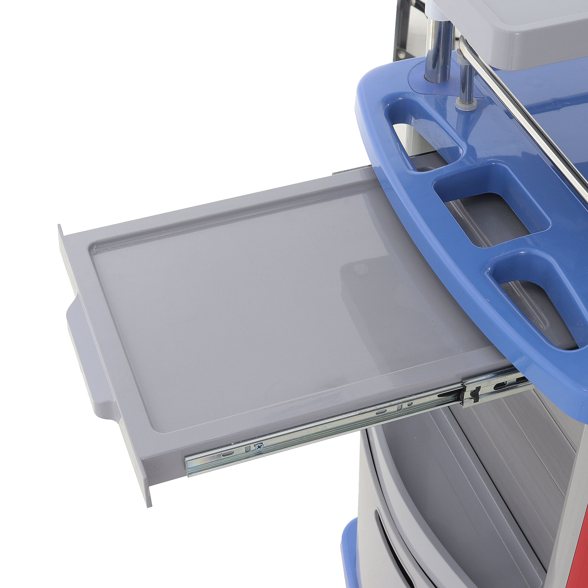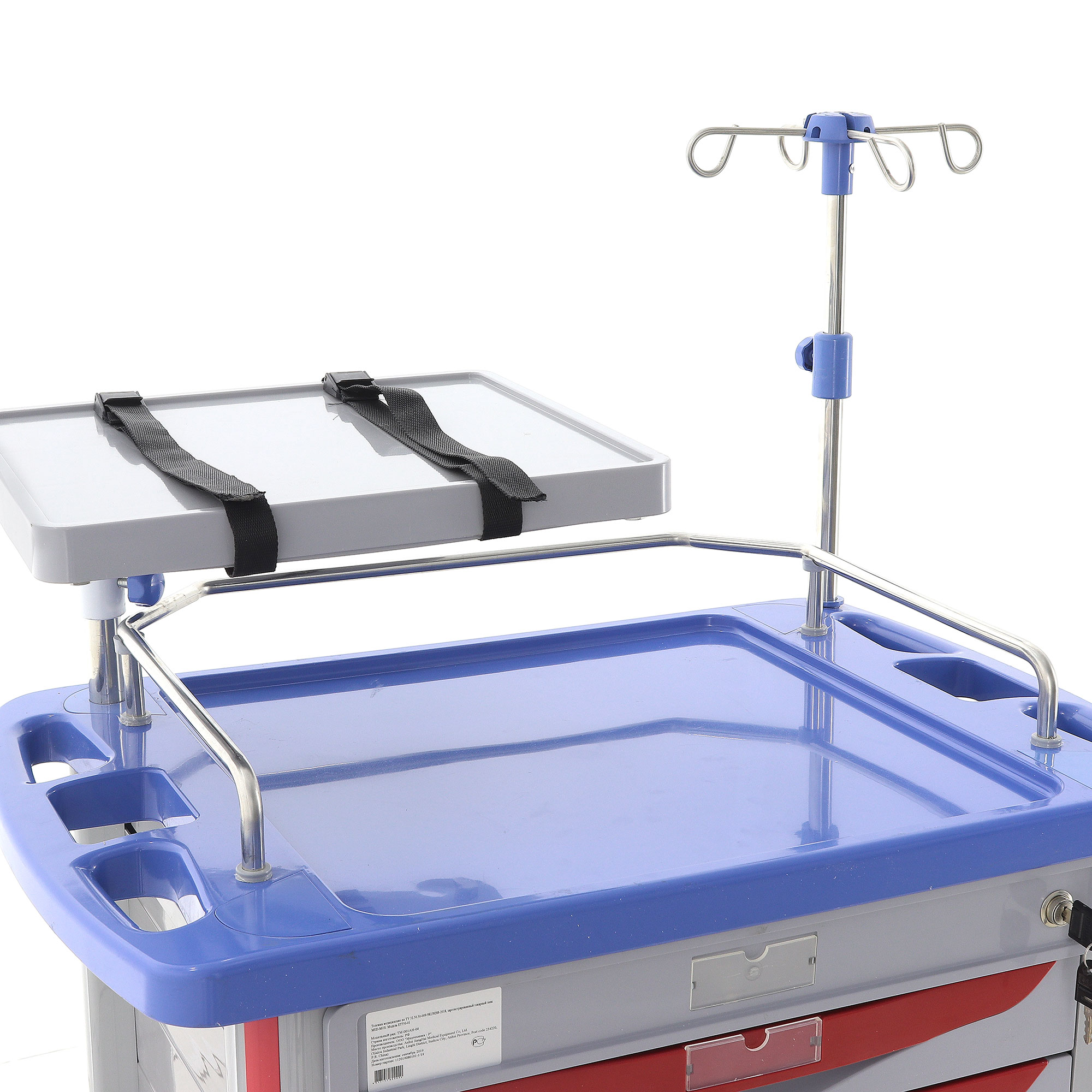 Медицинская тележка ET850-02 TM-021AH-00 (вариант исполнения "белый") разработана для экстренной медицинской помощи в условиях скорой помощи, реанимации и процедурных кабинетов. Она оснащена столешницей с нишей (520x470x19 мм) и П-образным ограждением из нержавеющей стали (высота 60–80 мм), двумя выдвижными ящиками с замком (513x365x50 мм и 513x364x120 мм), отделением с двумя пластиковыми дверками (280x417x24 мм) с доводчиками, поворотным столиком для дефибриллятора (385x331x32 мм) с ремнями и выдвижным столиком (400x60x320 мм). Инфузионная стойка с четырьмя крючками регулируется по высоте (1060–1760 мм). Каркас включает четыре пластиковых стойки с красными вставками и три пластиковые стенки белого цвета.