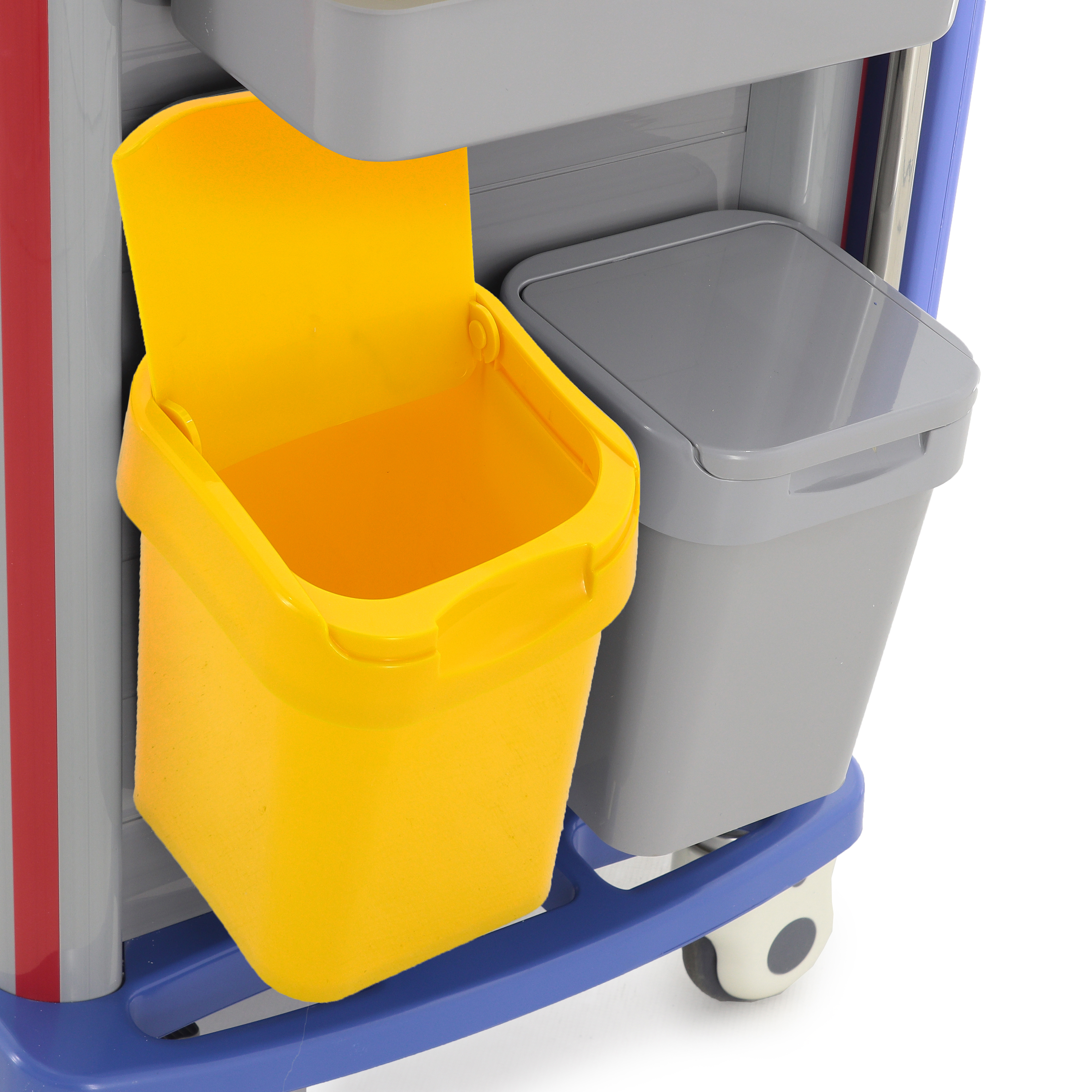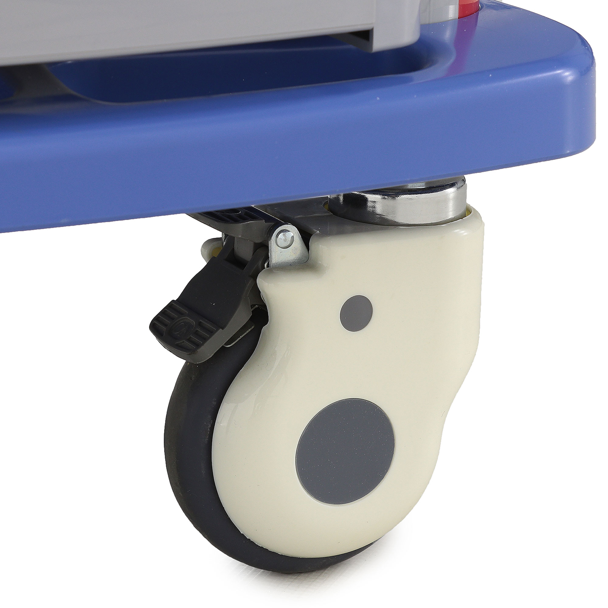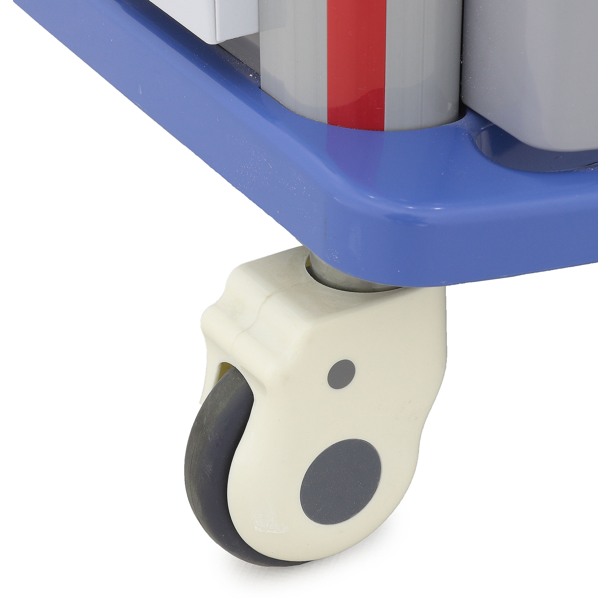 Тележка оснащена шестью навесными ёмкостями: двумя вёдрами с крышками (175x175x230 мм), двумя банками (_ 137x140 мм), откидным контейнером (345x100x360 мм) и навесным лотком (318x155x130 мм). Доска для сердечно-лёгочной реанимации (535x420x20 мм), держатель баллона с ремнями и розетка с кабелем (2,5 м) обеспечивают функциональность в критических ситуациях. Четыре колеса _ 80 мм (опционально _ 124 мм) с полиуретановыми шинами и тормозами на двух передних колёсах гарантируют мобильность. Габариты (940x550x1065 мм) и масса (41–42 кг) обеспечивают устойчивость. Все поверхности устойчивы к дезинфекции.