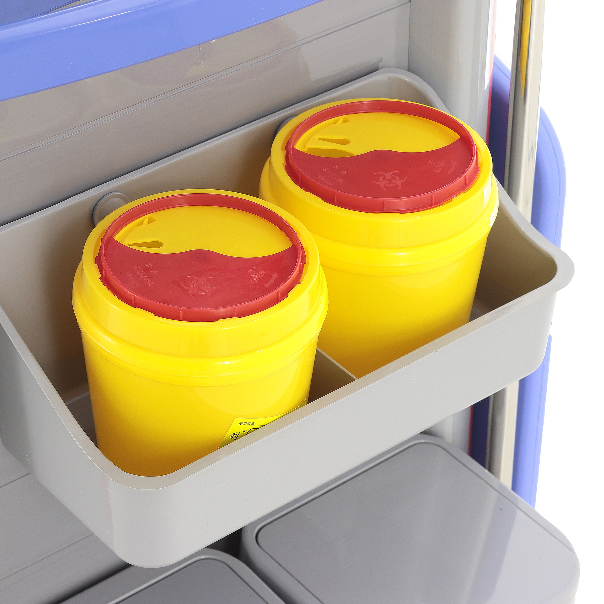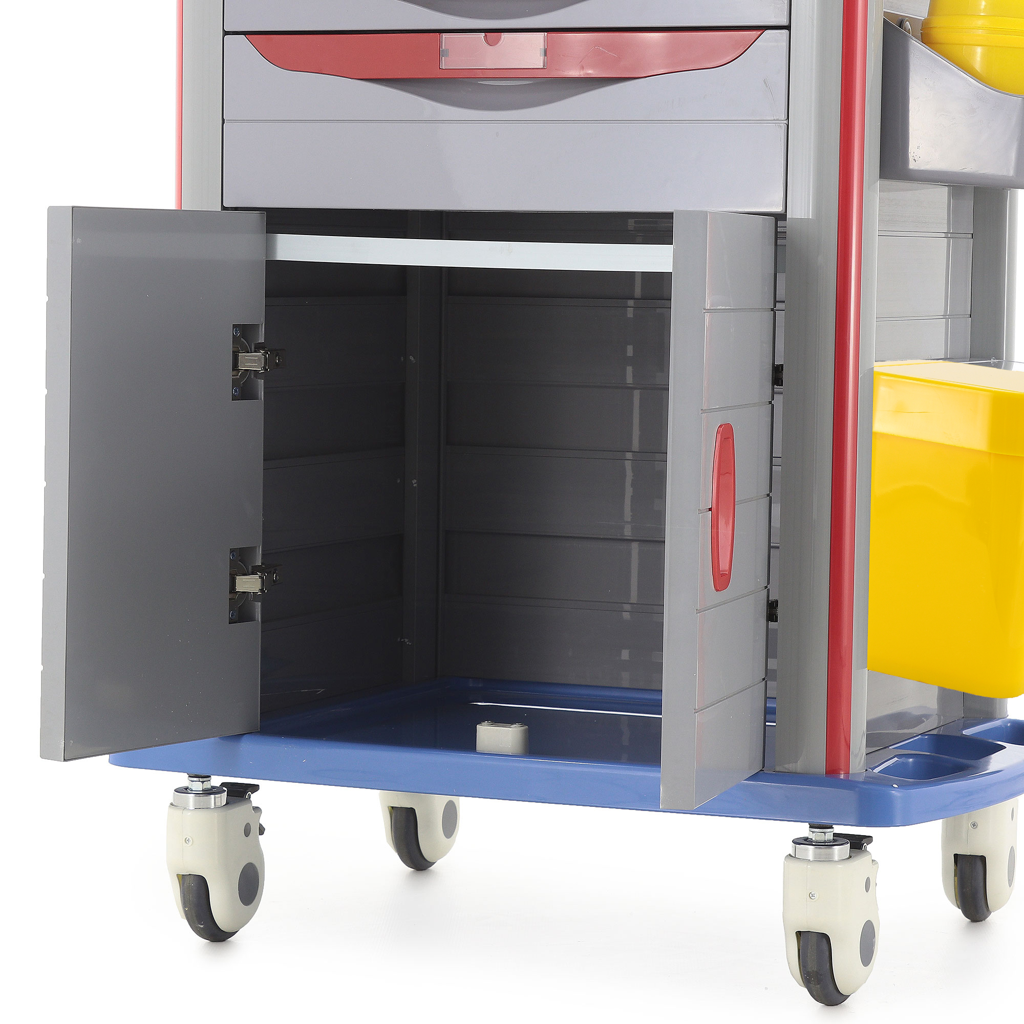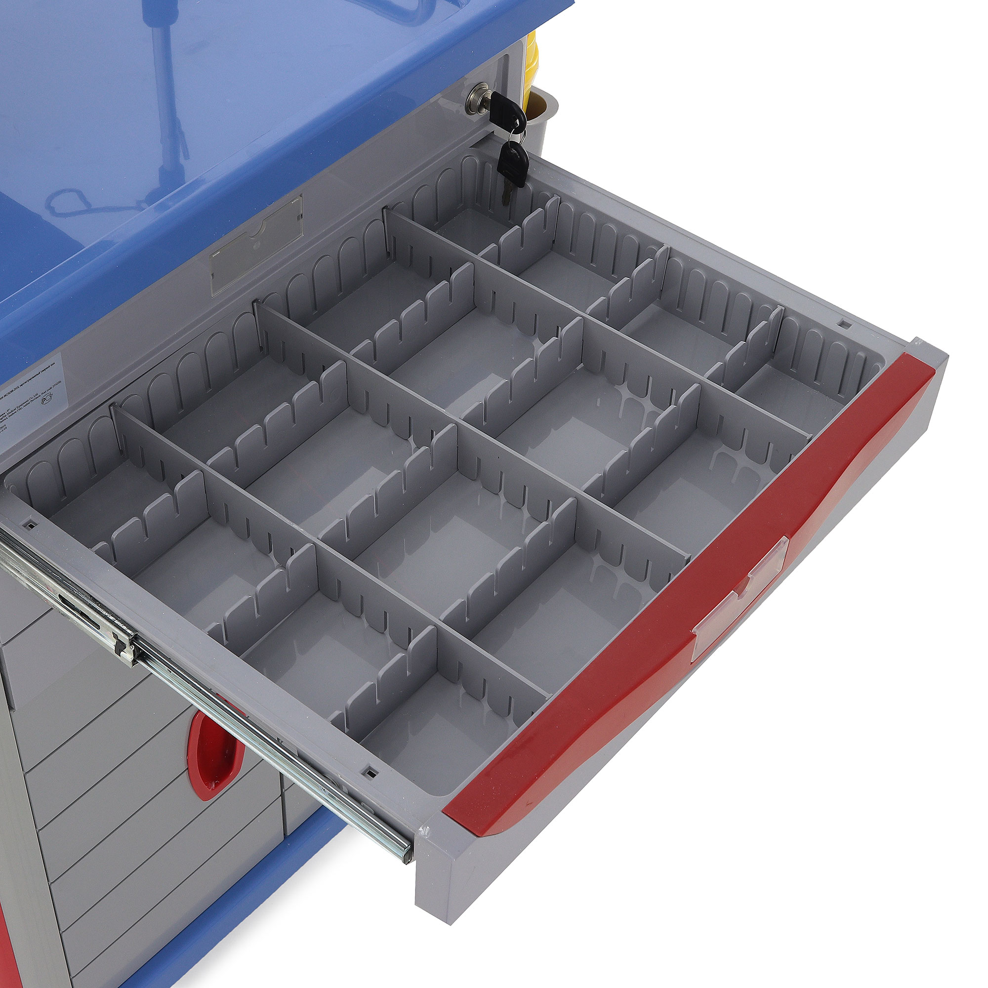 - Организация хранения: Два ящика с 12 перегородками, шесть навесных ёмкостей и отделение с дверками для медикаментов и инструментов.