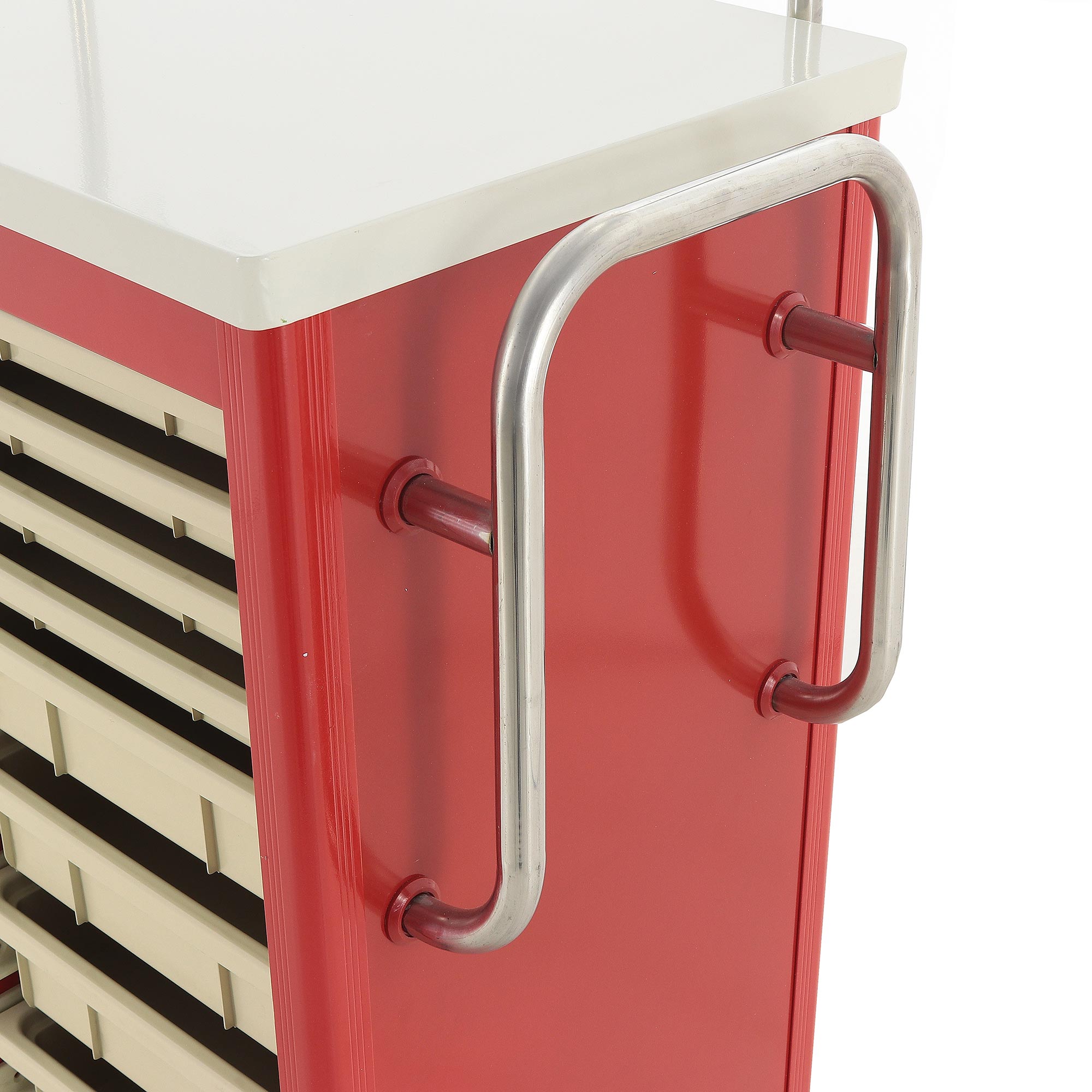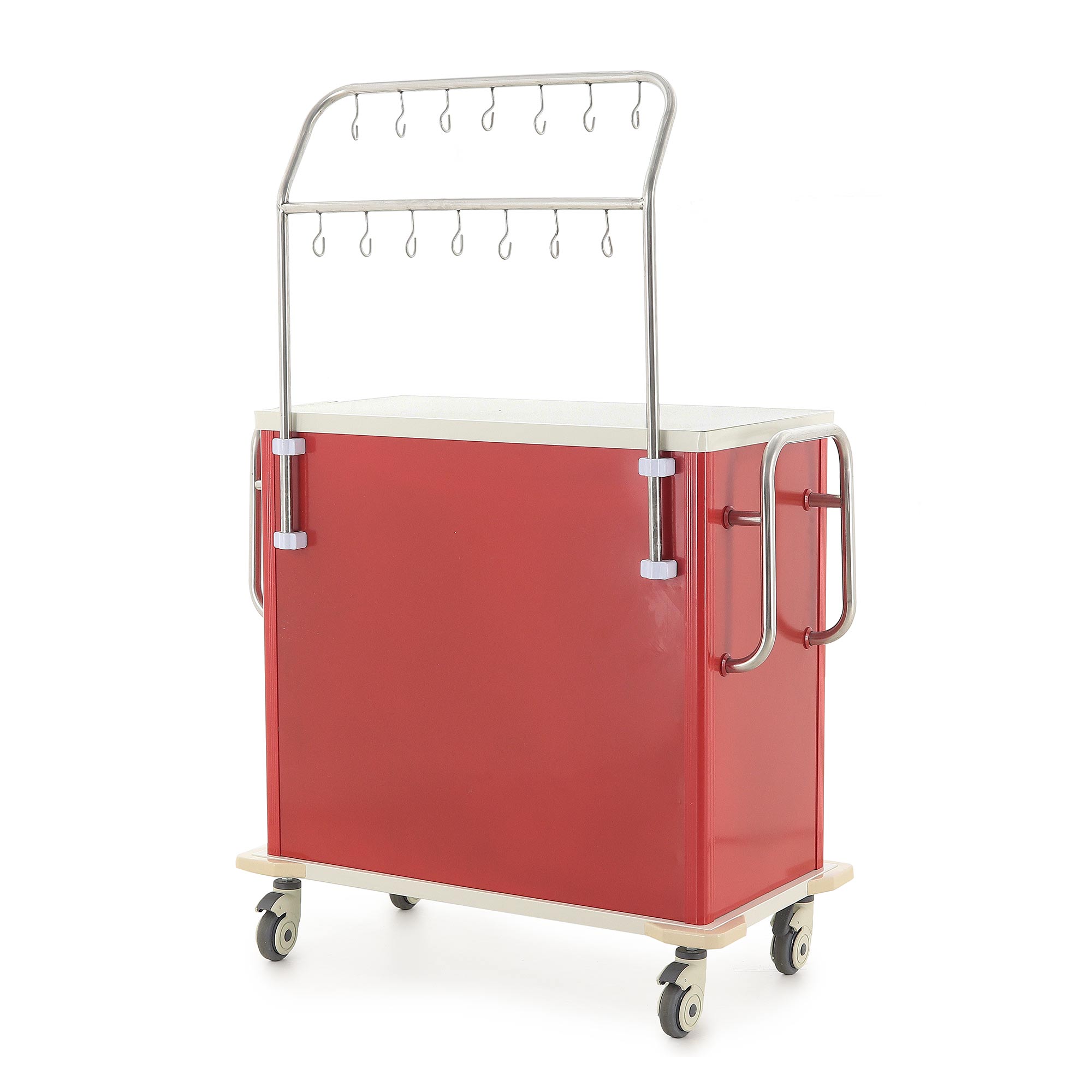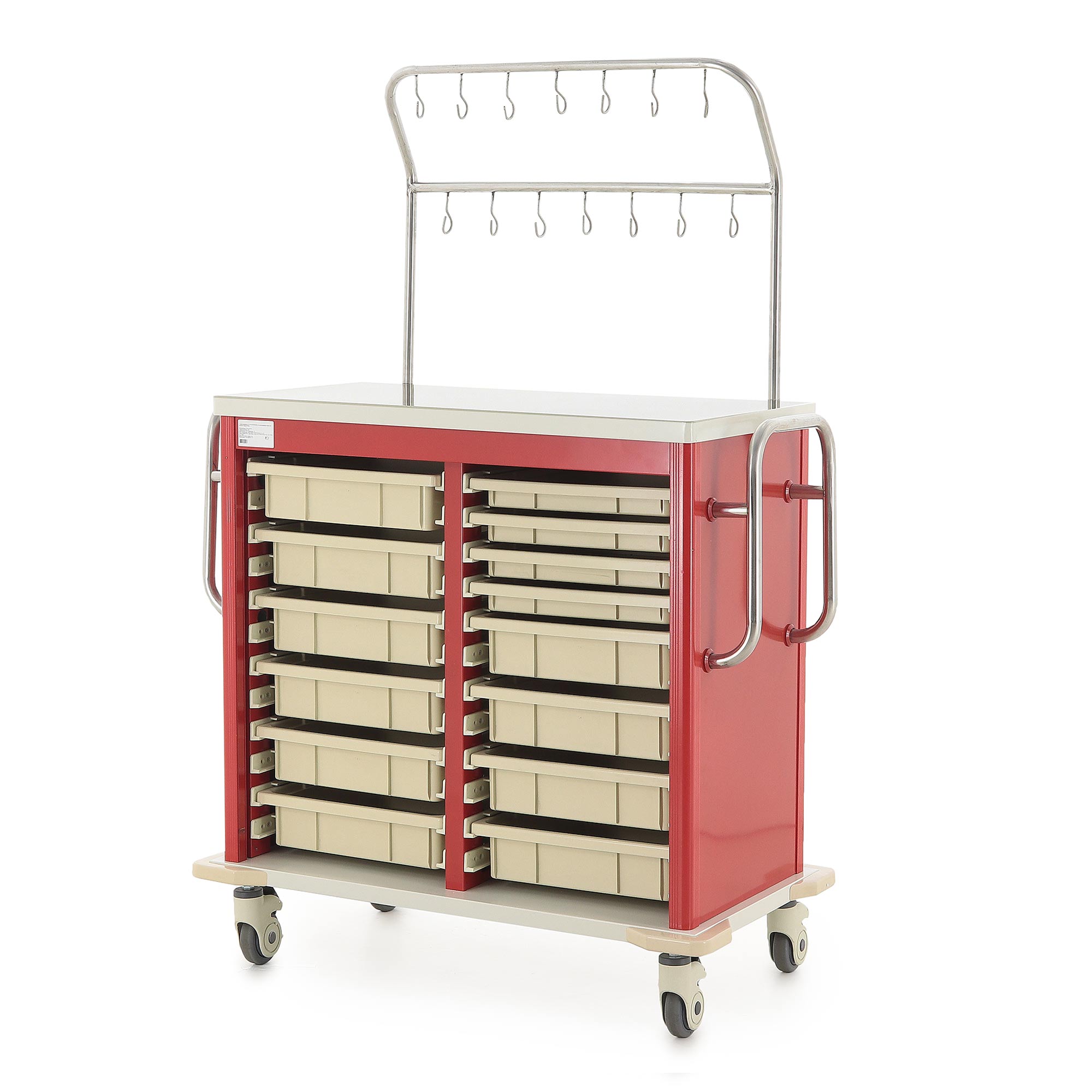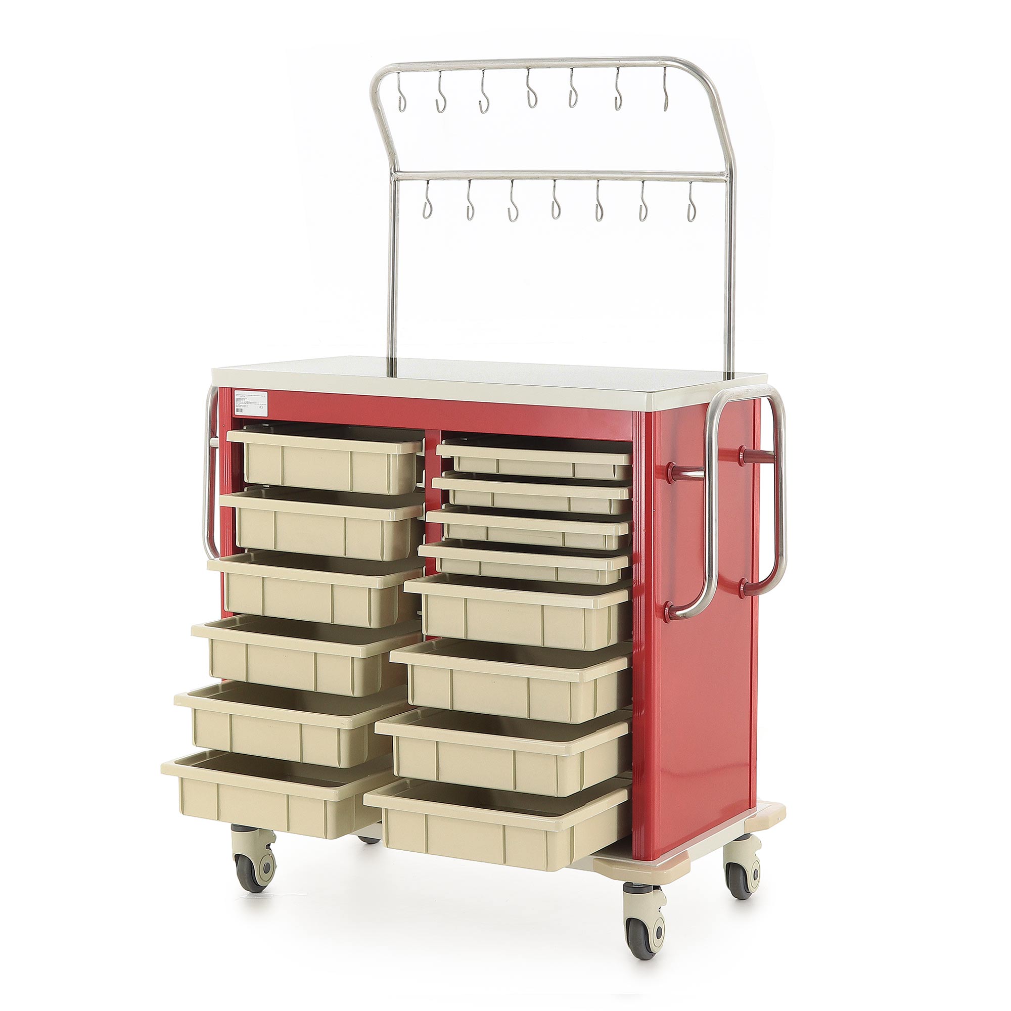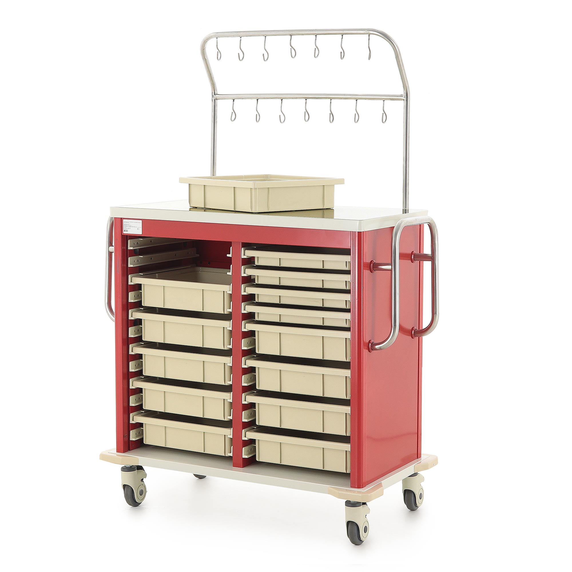Медицинская тележка ИТT006Х TM-013AH-00 разработана для проведения инфузионных вливаний в стационарах, процедурных кабинетах и отделениях интенсивной терапии. Она оснащена двухярусной инфузионной стойкой с 14 крючками (7 на каждом ярусе) для размещения флаконов и пакетов с растворами, а также восемью съёмными пластиковыми лотками (четыре размером 350x350x47 мм и четыре — 350x350x97 мм) для хранения медицинских принадлежностей. Каркас включает четыре алюминиевые стойки красного цвета, одну стальную сварную стойку и три стальные стенки, покрытые ударопрочной эмалью красного цвета. Основание и столешница выполнены из гнутого стального листа с эмалевым покрытием бело-серого цвета.