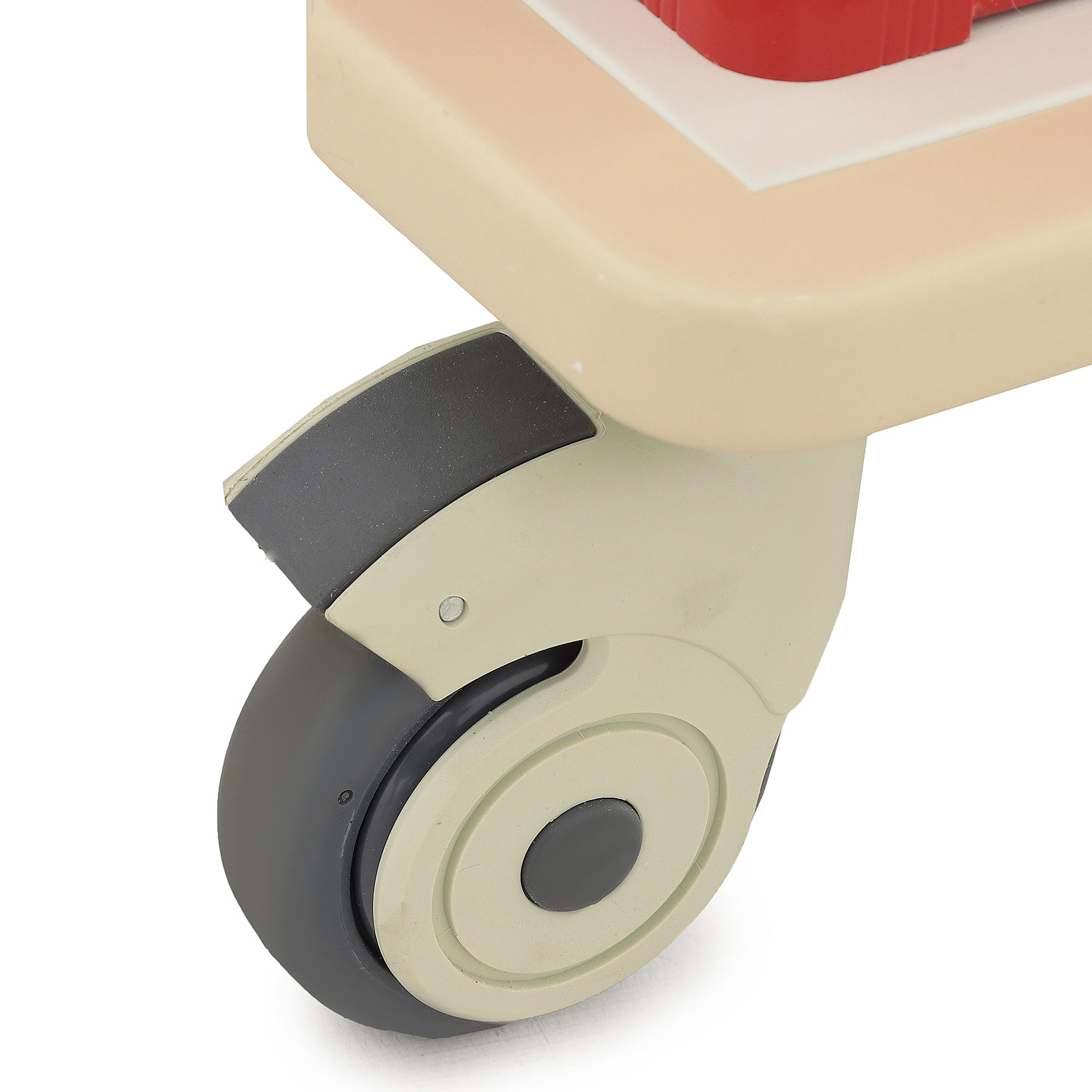 Тележка оснащена четырьмя самоориентирующимися колёсами _ 100 мм с полиуретановыми шинами и тормозами на двух передних колёсах, а также двумя транспортировочными ручками из нержавеющей стали для удобства перемещения. Защитные бамперы из бежевого пластика на углах основания обеспечивают безопасность. Габариты (1110x558x1035 мм, с инфузионной стойкой — 1635 мм) и масса (57,4 кг) гарантируют устойчивость и надёжность. Поверхности устойчивы к дезинфекции, что делает тележку гигиеничной и удобной для эксплуатации.