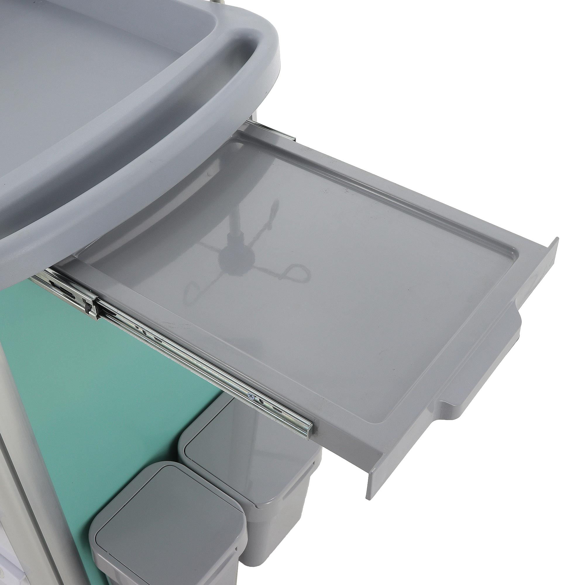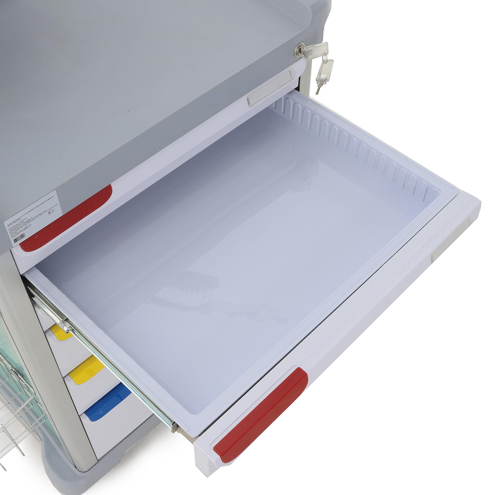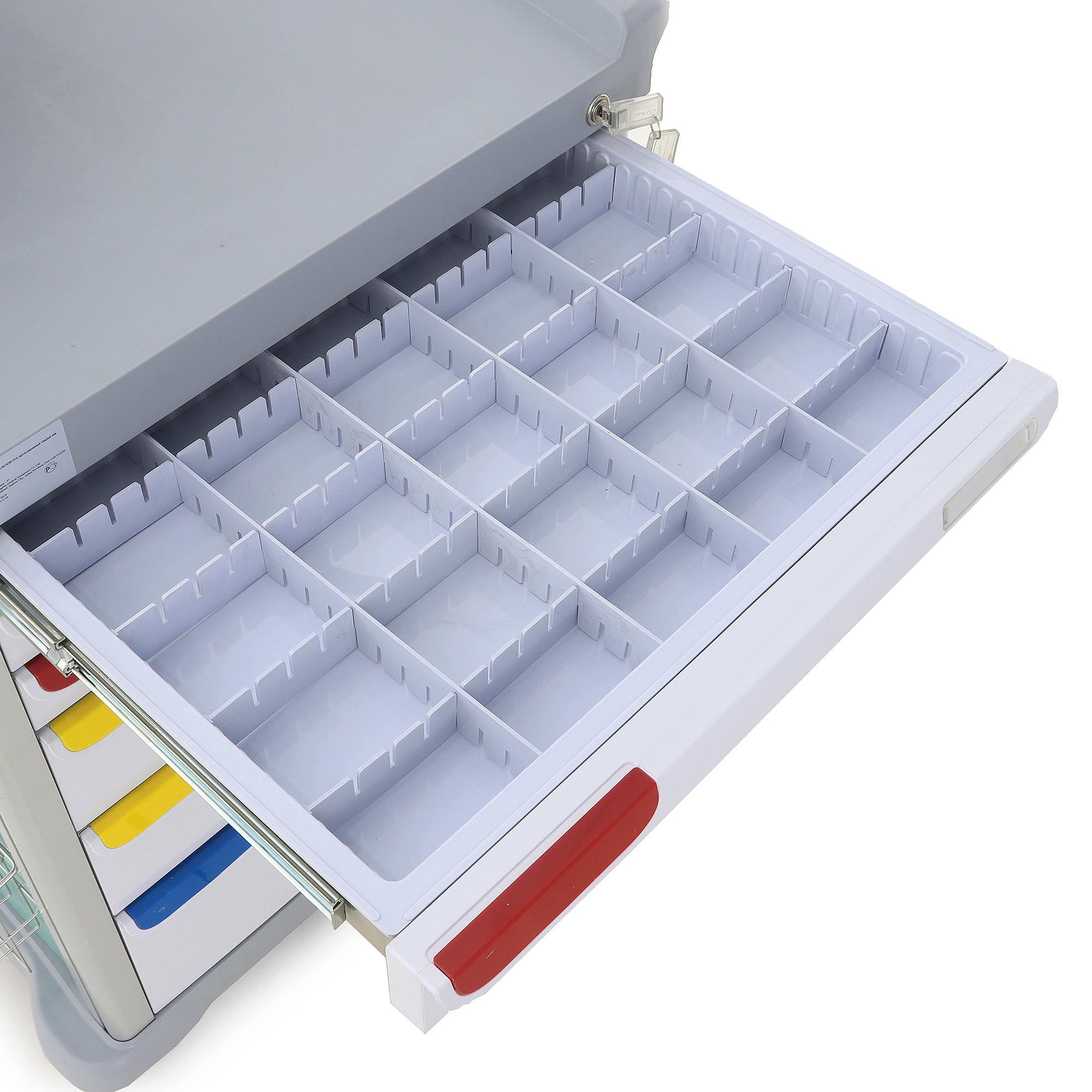 - Вместительность: Шесть ящиков с 36 перегородками, шесть навесных ёмкостей и выдвижной столик (220x34x353 мм) для инструментов и медикаментов.