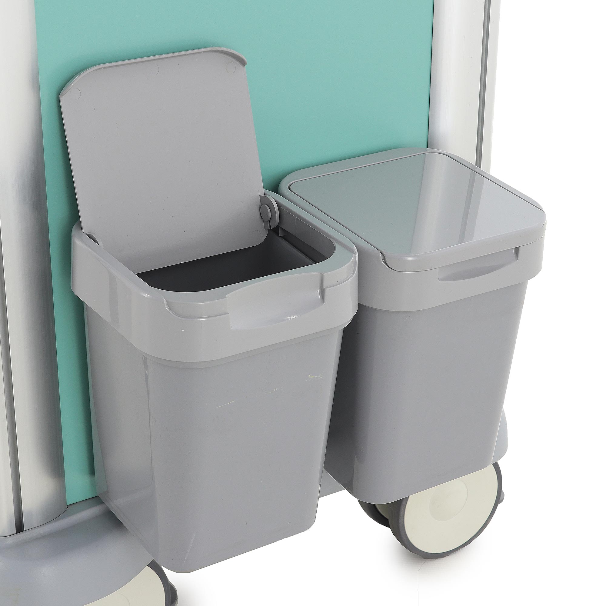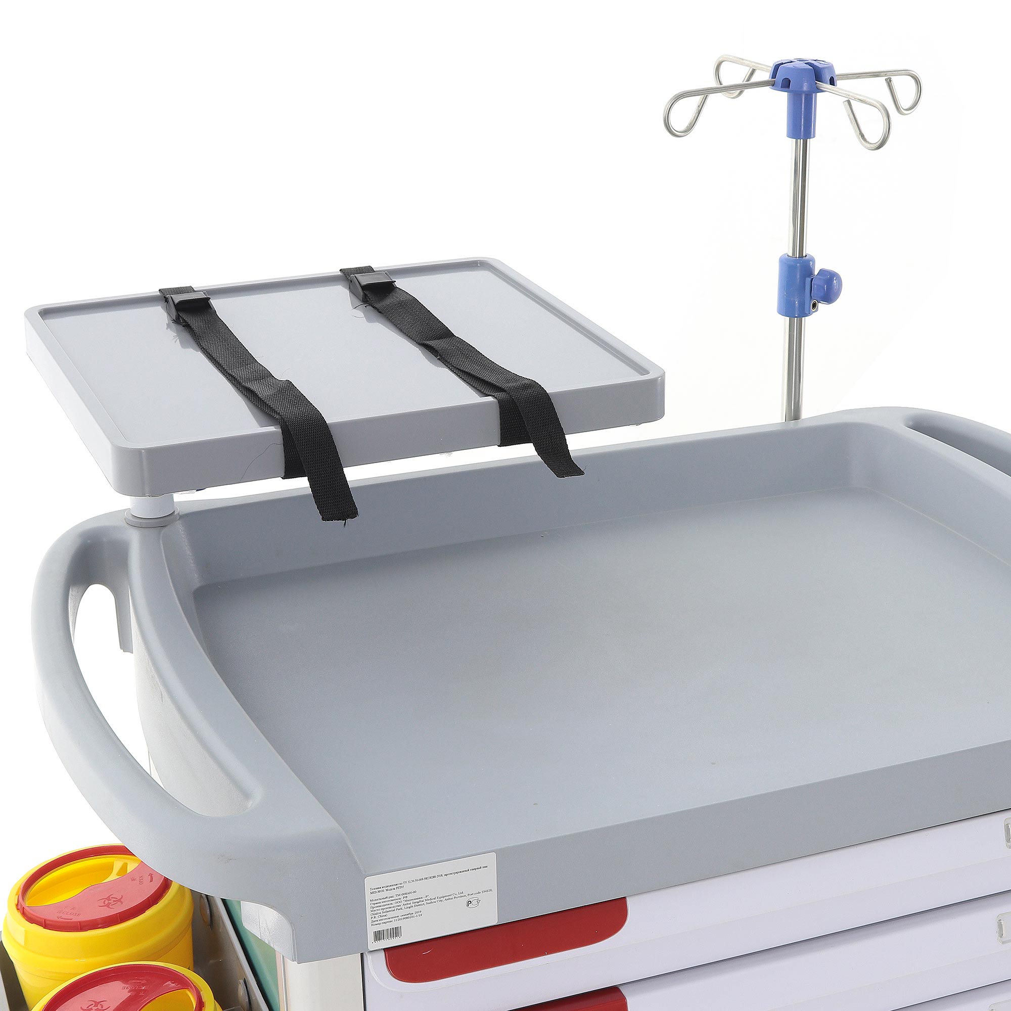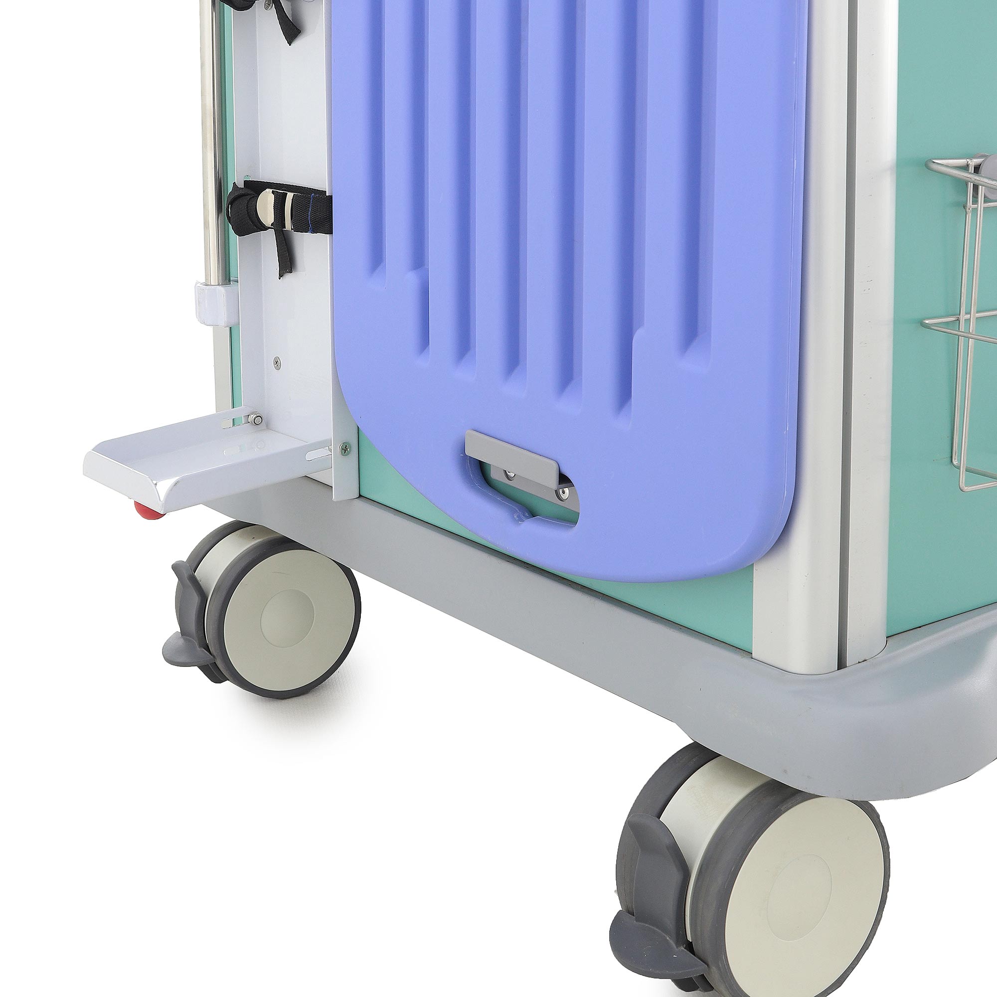 Тележка включает шесть навесных ёмкостей: два ведра (серое и жёлтое), две банки (жёлтые с красной крышкой), лоток и корзину. Четыре двойных колеса _ 100 мм (опционально _ 125 мм) с тормозами обеспечивают высокую мобильность. Габариты (960x540x1005 мм) и масса (42–56,8 кг) гарантируют устойчивость и удобство в экстренных ситуациях. Все поверхности устойчивы к дезинфекции, обеспечивая гигиеничность.