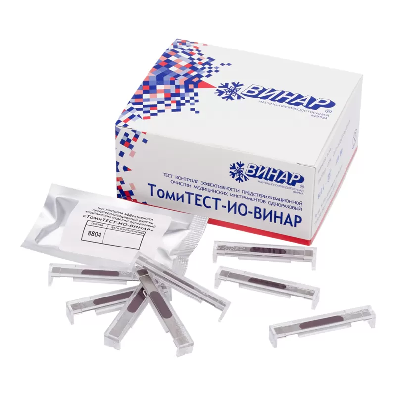 - ТомиТЕСТ-ИО представляет собой упакованный в индивидуальный защитный металлополимерный пакет одноразовый макет инструмента. Тест состоит из конструкции из термостойкого полимера и металлической пластины с тестовым загрязнением, имитирующим коагулированную человеческую кровь.