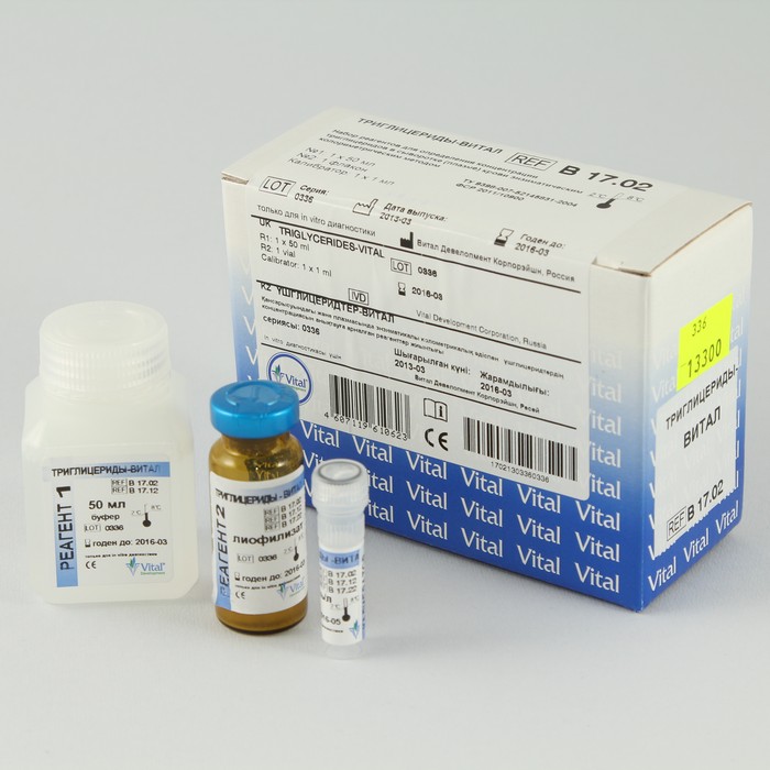 Диагностический набор ТРИГЛИЦЕРИДЫ-ВИТАЛ (В 17.02) для определения концентрации триглицеридов в сыворотке (плазме) крови энзиматическим колориметрическим методом.