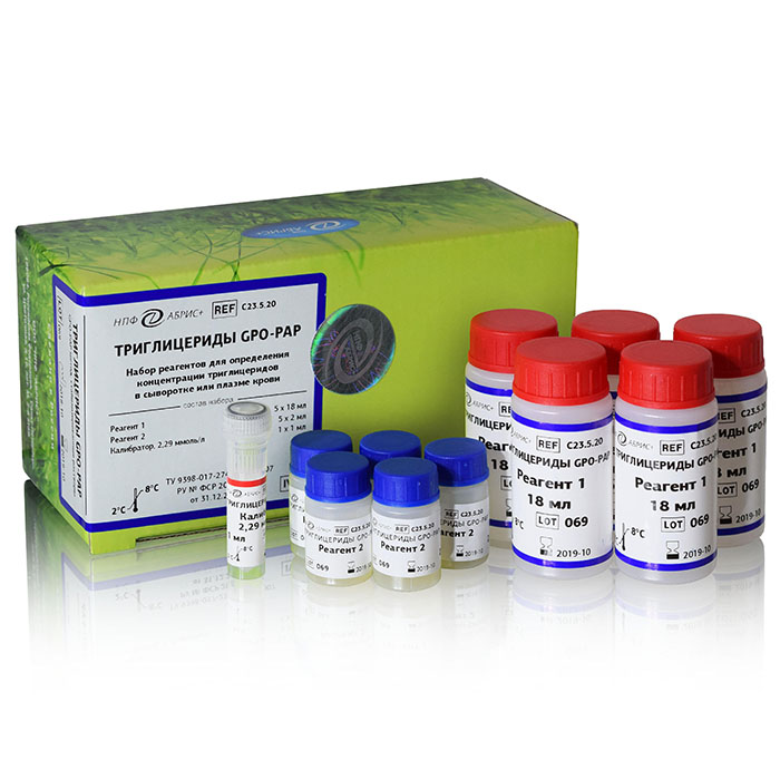 Набор реагентов для определения концентрации триглицеридов в сыворотке и плазме крови энзиматическим колориметрическим методом.