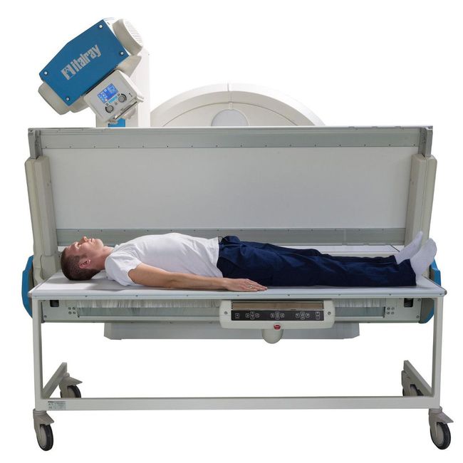 - Система позиционирования пациента разработана таким образом‚ что позволяет регулировать высоту деки стола и ее перемещение с помощью кругового вращения и поворота вокруг своей оси. Для удобства персонала тяжелые пациенты могут быть обследованы прямо на столе для перевозки больных без перемещения на деку стола.
