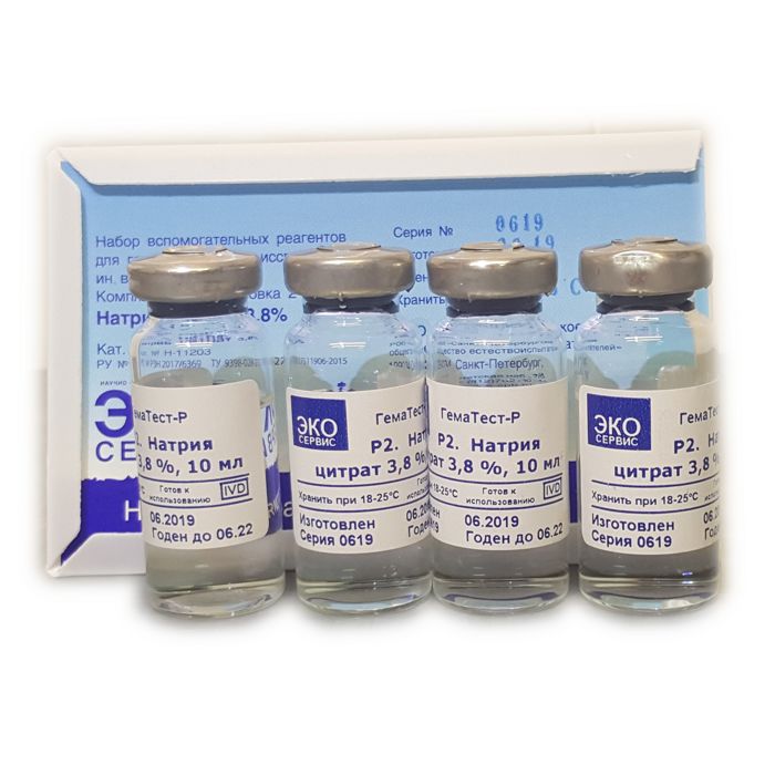 Готовый к применению 3,8% раствор цитрата натрия для стабилизации крови при исследовании системы гемостаза, 4 фл. по 10 мл.