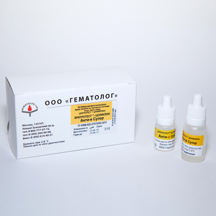ЭРИТРОТЕСТ-ЦОЛИКЛОН Анти-е Супер содержит моноклональные полные (IgM) анти-е антитела. Позволяет выявлять на эритроцитах антигены системы резус hr"(е) в простых реакциях с нативными эритроцитами: в реакции прямой гемагглютинации на плоскости или в пробирочном тесте.
