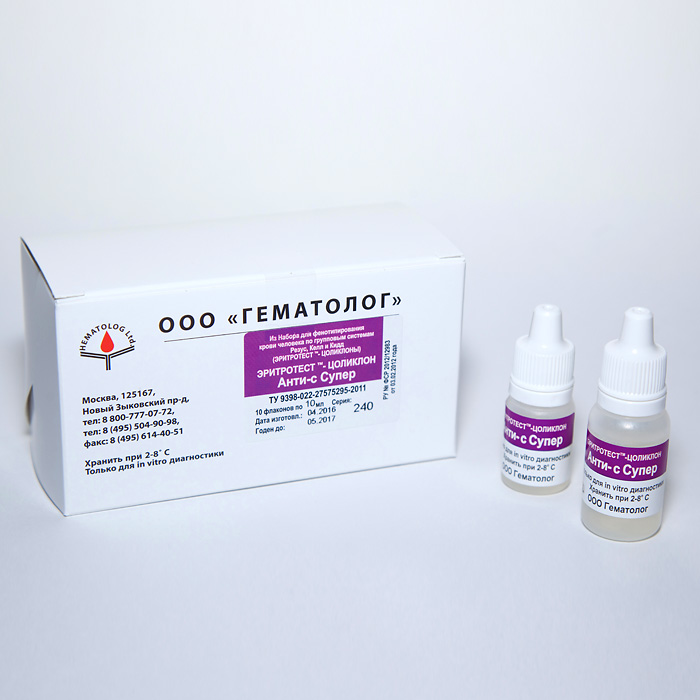 ЭРИТРОТЕСТ-ЦОЛИКЛОН Анти-c Супер содержит моноклональные полные (IgM) анти-c антитела. Позволяет выявлять на эритроцитах антигены системы резус hr’(с) в простых реакциях с нативными эритроцитами: в реакции прямой гемагглютинации на плоскости или в пробирочном тесте.