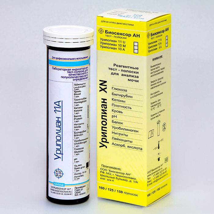Тест-полоски индикаторные УРИПОЛИАН-11А предназначены для качественного и полуколичественного определения глюкозы, кетоновых тел, скрытой крови, билирубина, уробилиногена, нитритов, отн. плотности, лейкоцитов, аскорбиновой кислоты, белка и рН в моче.