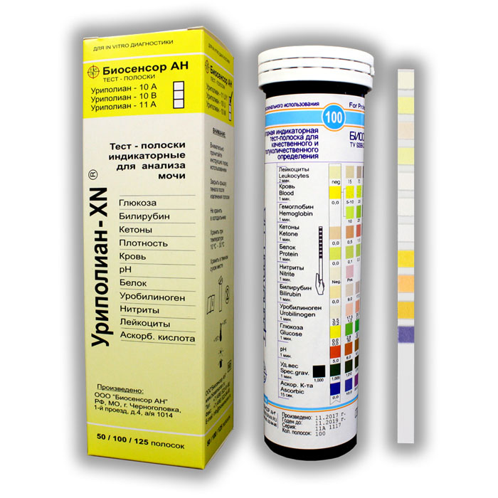 Тест-полоски индикаторные УРИПОЛИАН-11А предназначены для качественного и полуколичественного определения глюкозы, кетоновых тел, скрытой крови, билирубина, уробилиногена, нитритов, отн. плотности, лейкоцитов, аскорбиновой кислоты, белка и рН в моче.