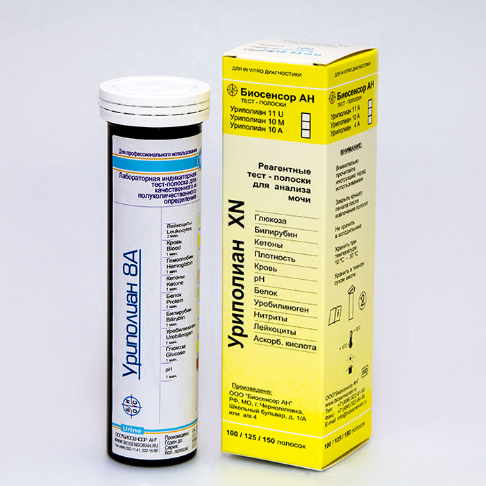 Тест-полоски индикаторные УРИПОЛИАН-8А предназначены для качественного и полуколичественного определения глюкозы, кетоновых тел, скрытой крови, билирубина, уробилиногена, лейкоцитов, белка и рН в моче.