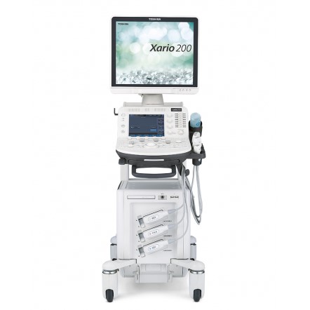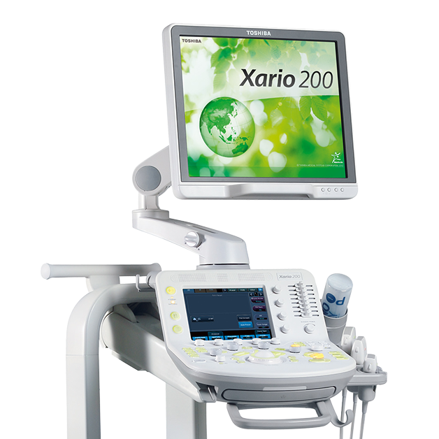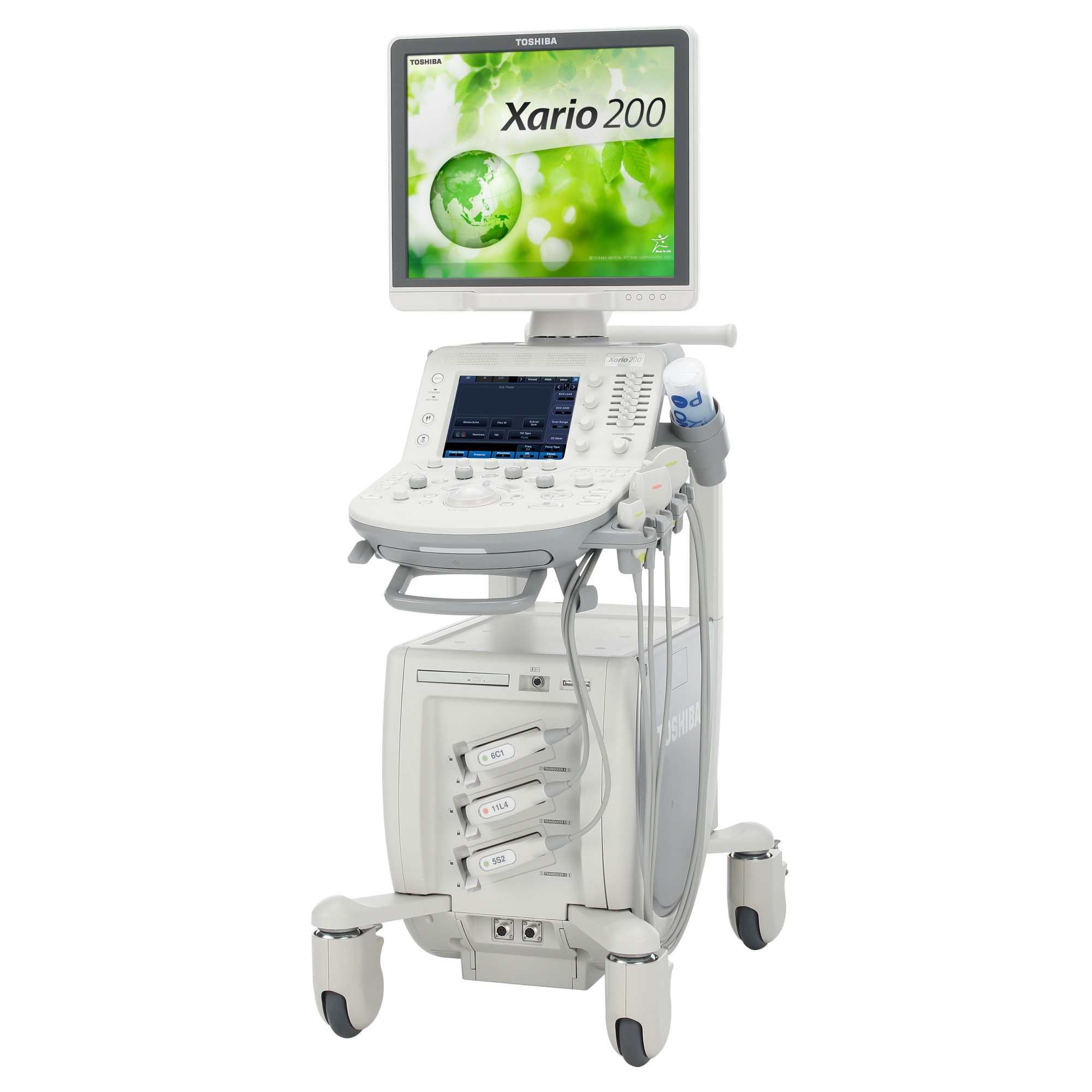 УЗИ-аппарат Toshiba Xario 200 поддерживает стандарт DICOM® 3.0, передает изображения через USB, сеть или встроенный DVD-привод, имеет три разъема для датчиков и сенсорный экран.