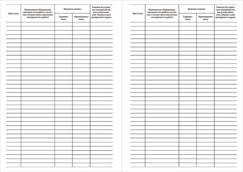- Отметки об устранении неисправностей, кем и когда выполнено. Подпись и дата проверявшего журнал.