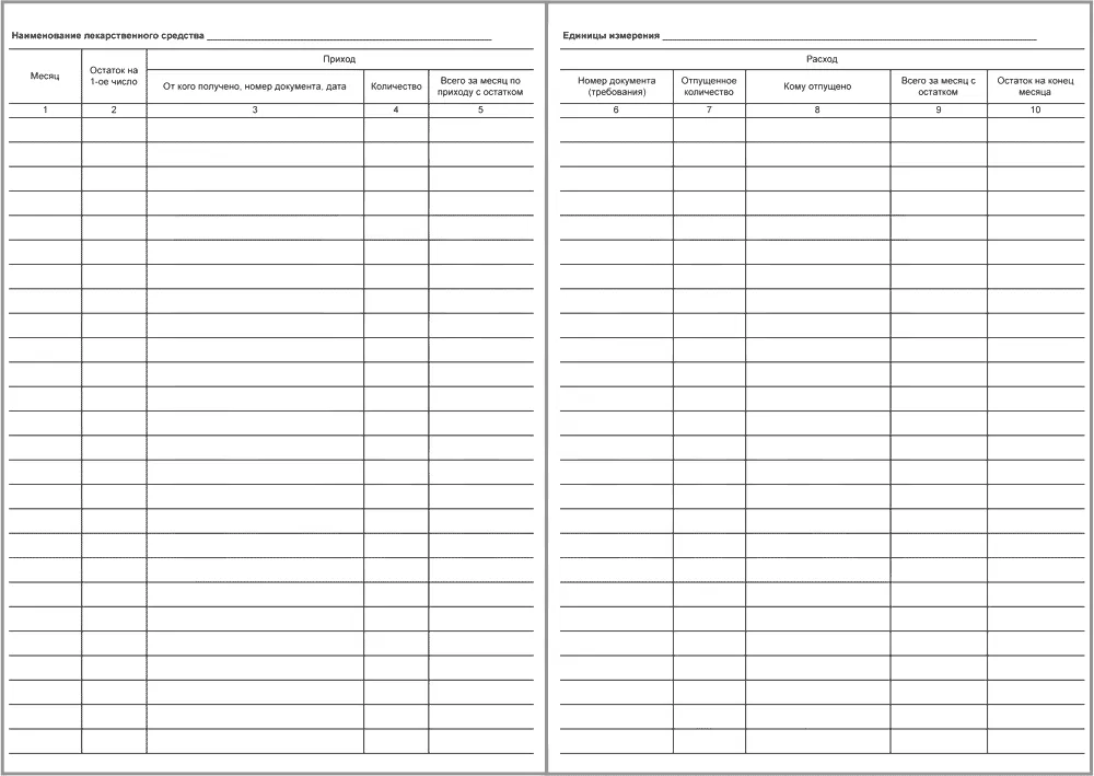 Форма данного журнала состоит из приходной и расходной частей. Поступления лекарственных средств отображены в приходной части, соответственно, в расходной части отображена информация о том, кому и когда, на основании какого документа был отпущен препарат, а также наличие остатков на конец месяца.