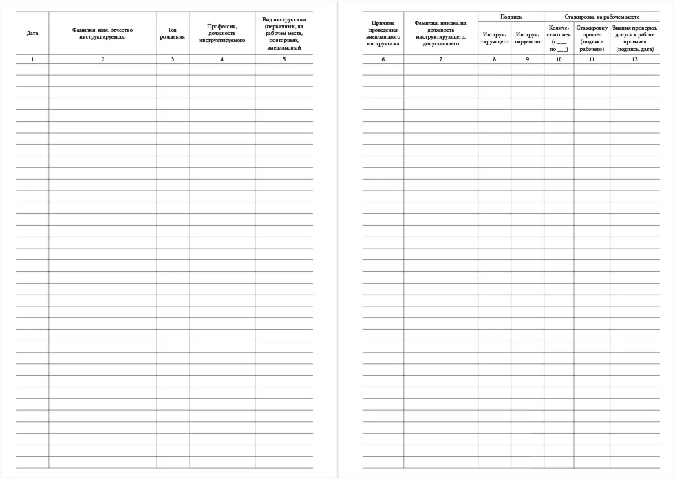 Бланк формы журнала регистрации инструктажа на рабочем месте содержит следующие графы: