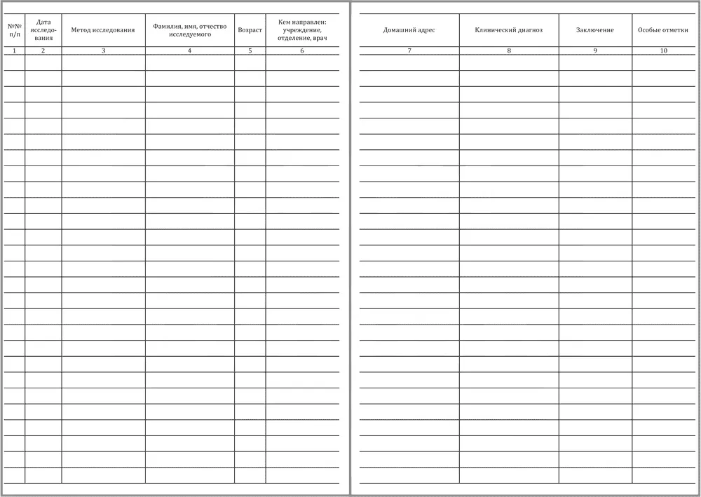 Графы для заполнения журнала регистрации исследований, выполняемых в отделе, отделении, кабинете эндоскопии, форма № 157/у-96: