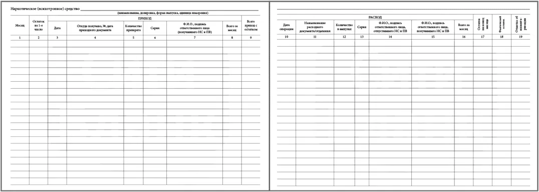 Графы для заполнения Журнала регистрации операций, связанных с оборотом наркотических средств психотропных веществ у старшей медицинской сестры:
