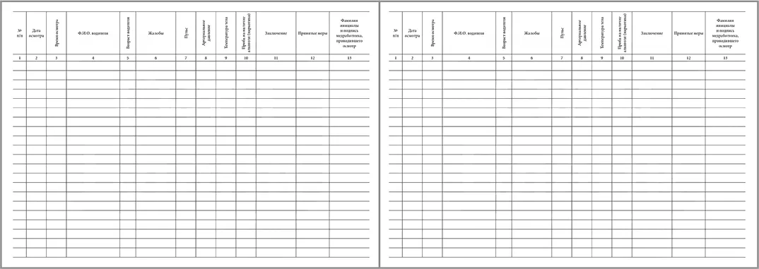 Журнал регистрации послерейсовых осмотров водителей. Форма соответствует Приказу Министерства здравоохранения РФ от 15 декабря 2014 г. N 835н "Об утверждении Порядка проведения предсменных, предрейсовых и послесменных, послерейсовых медицинских осмотров".