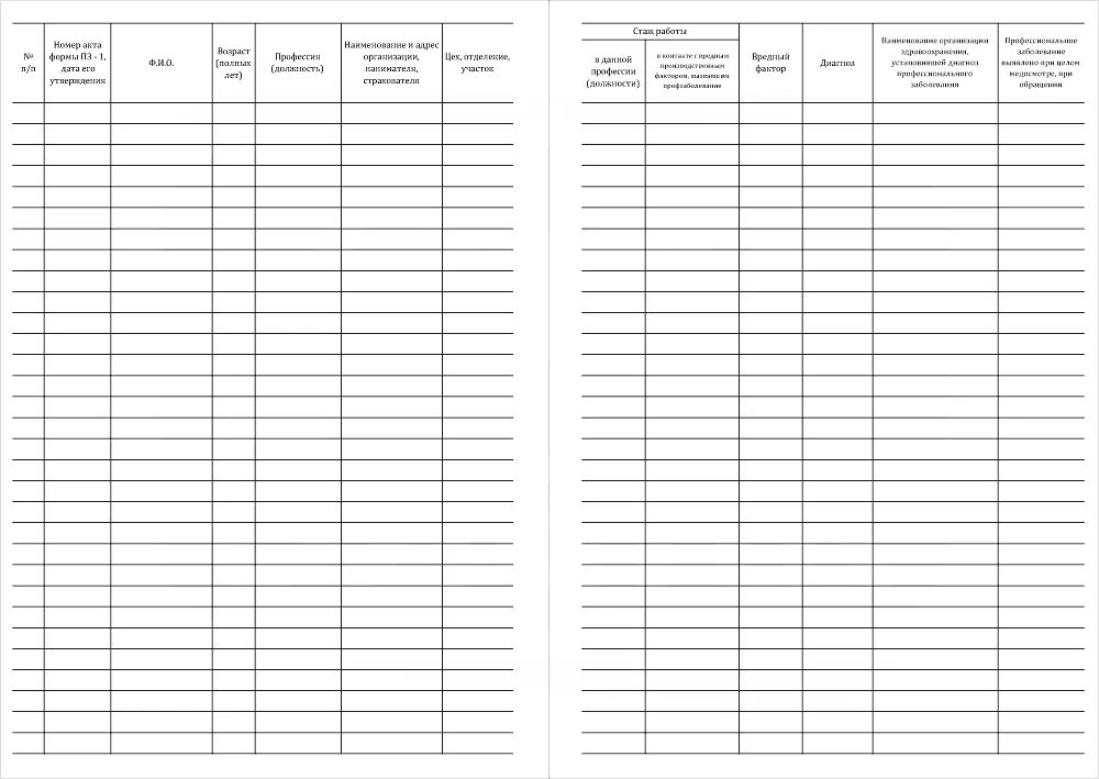 Графы для заполнения журнала регистрации профессиональных заболеваний: