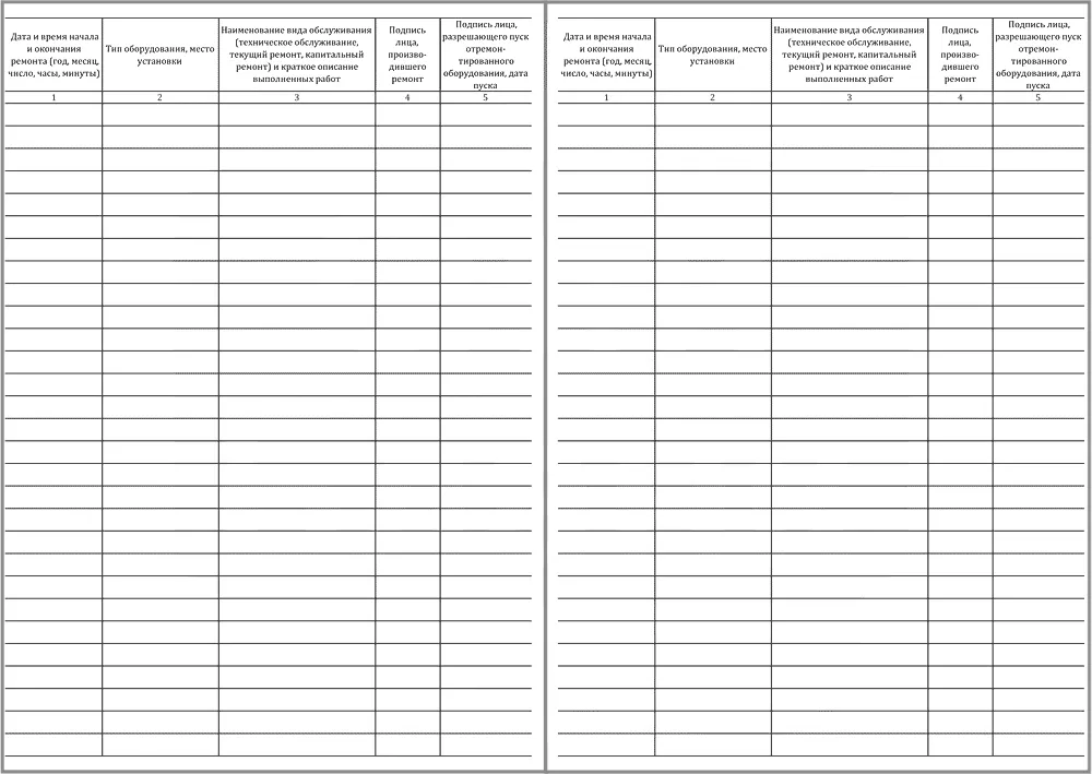 Графы для заполнения журнала технического обслуживания и ремонта оборудования (Форма 39 э):