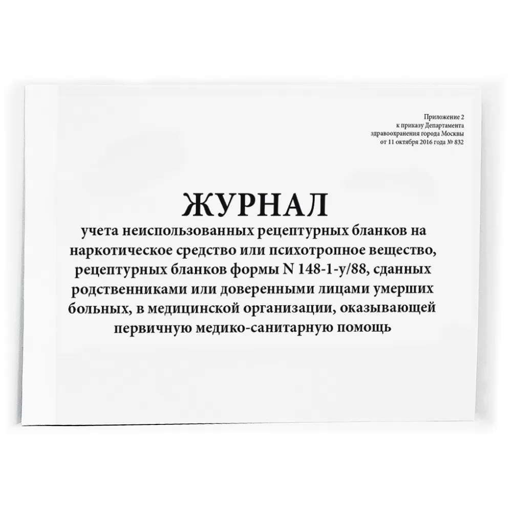 Журнал учета неиспользованных рецептурных бланков на наркотическое средство или психотропное вещество, рецептурных бланков формы N 148-1-у/88, сданных родственниками или доверенными лицами умерших больных, в медицинской организации, оказывающей первичную медико-санитарную помощь. Приложение 2 к приказу Департамента здравоохранения города Москвы от 11 октября 2016 года № 832