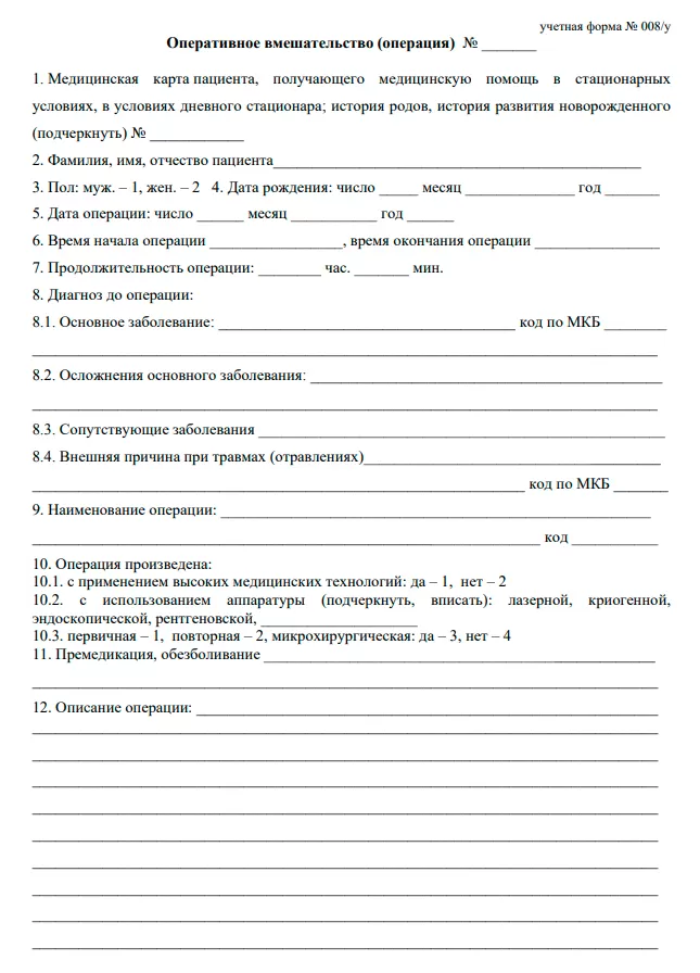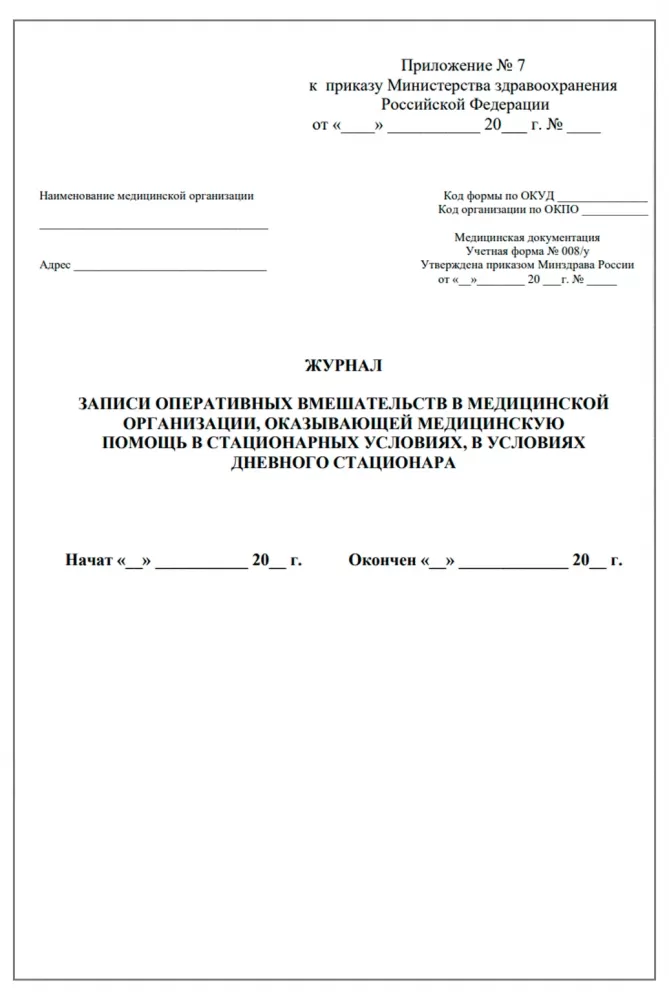 Журнал учета оперативных вмешательств (операций) в медицинской организации, оказывающей медицинскую помощь в стационарных условиях, в условиях дневного стационара (Учетная форма № 008/у)