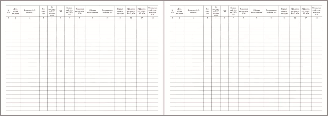 Графы для заполнения журнала введения РФП пациентам: