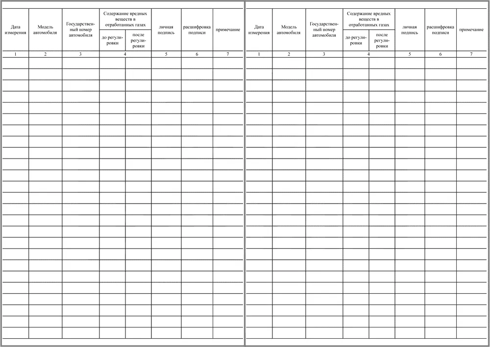 Графы для заполнения Журнала записи результатов проверок автомобилей на содержание окиси углерода и углеводородов: